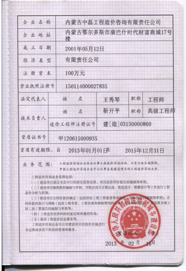 內蒙古中磊工程造價咨詢有限責任公司(隸屬于內蒙古中磊集團),于2004年5月19日由內蒙古自治區(qū)工商行政管理部門批準成立(注冊號:150114000027835),法定代表人:王秀琴,資質等級為甲級(證書編號:甲120615000935),公司辦公地點位于鄂爾多斯市東勝區(qū)達拉特南路36號樓,公司現有專業(yè)技術人員52人,其中:注冊造價工程師11人、中級預算員及專業(yè)技術人員35人(其中:高級工程師5人,工程師20人)、管理及工勤人員6人,設有六個審計項目部。業(yè)務范圍包括:項目可行性研究投資估算及經濟評價報告的編制和審核;建設工程預算、結算、竣工結(決)算編制和審核;工程招標標底、投標報價的編制和審核;建設項目工程價款的確定(合同價款的簽訂和調整);提供建設項目實施階段的工程造價監(jiān)控及工程索賠業(yè)務的咨詢服務;工程造價經濟糾紛的鑒定和仲裁的咨詢。