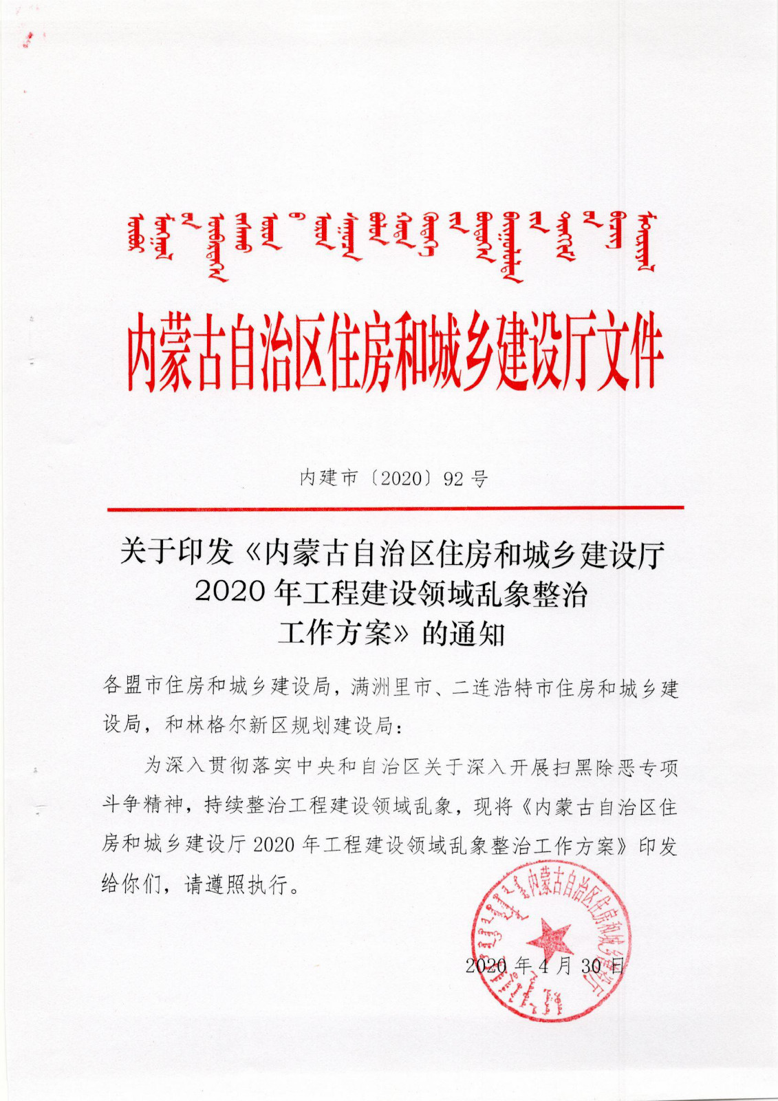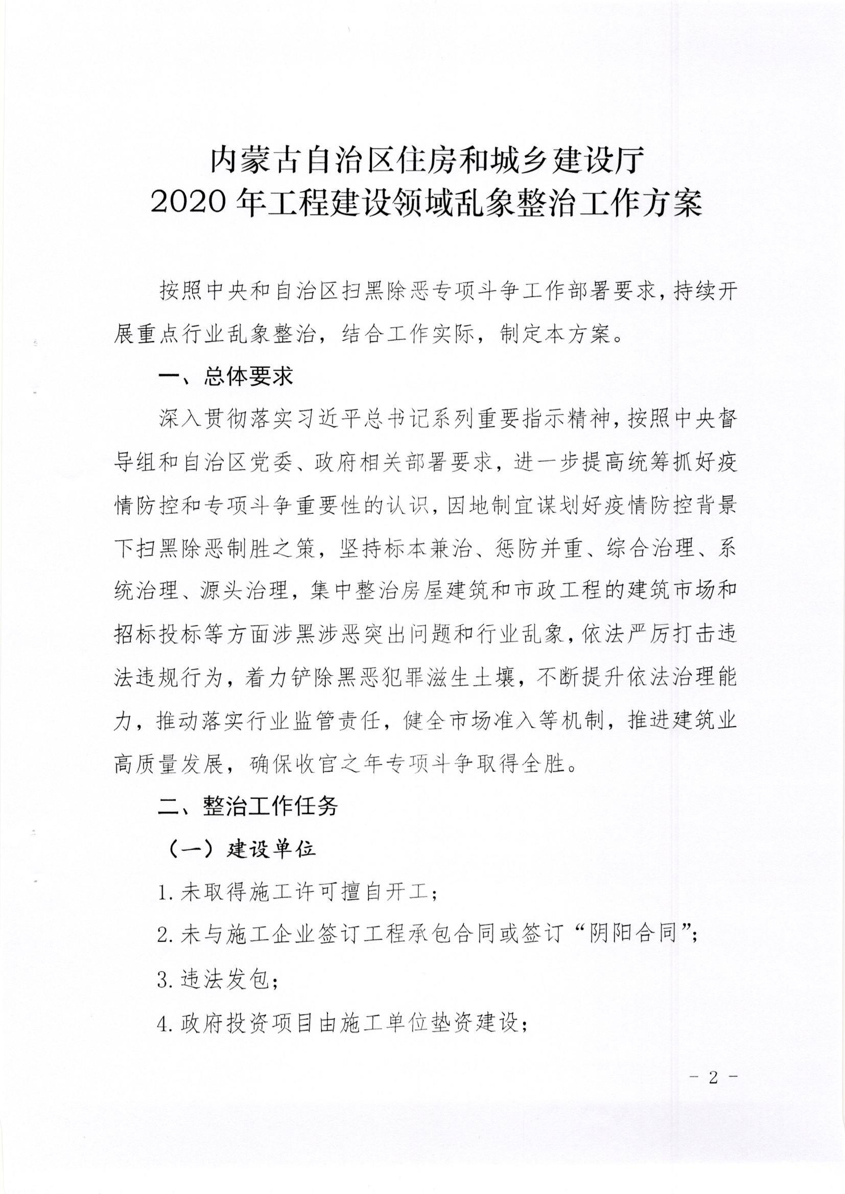 關于印發(fā)《內蒙古自治區(qū)住房和城鄉(xiāng)建設廳2020年工程建設領域亂象整治工作方案》的通知