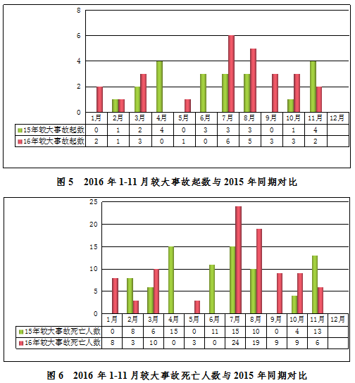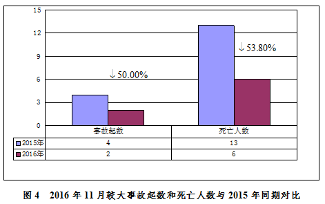 2016年11月,全國(guó)共發(fā)生房屋市政工程生產(chǎn)安全較大事故2起、死亡6人,比去年同期事故起數(shù)減少2起、死亡人數(shù)減少7人,同比分別下降50.00%和53.80%(見(jiàn)圖4)。