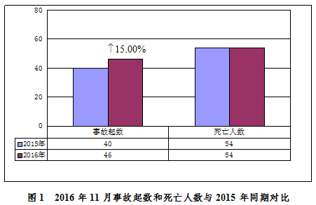 2016年11月,全國(guó)共發(fā)生房屋市政工程生產(chǎn)安全事故46起、死亡54人,比去年同期事故起數(shù)增加6起,同比上升15.00%,死亡人數(shù)持平(見(jiàn)圖1)。