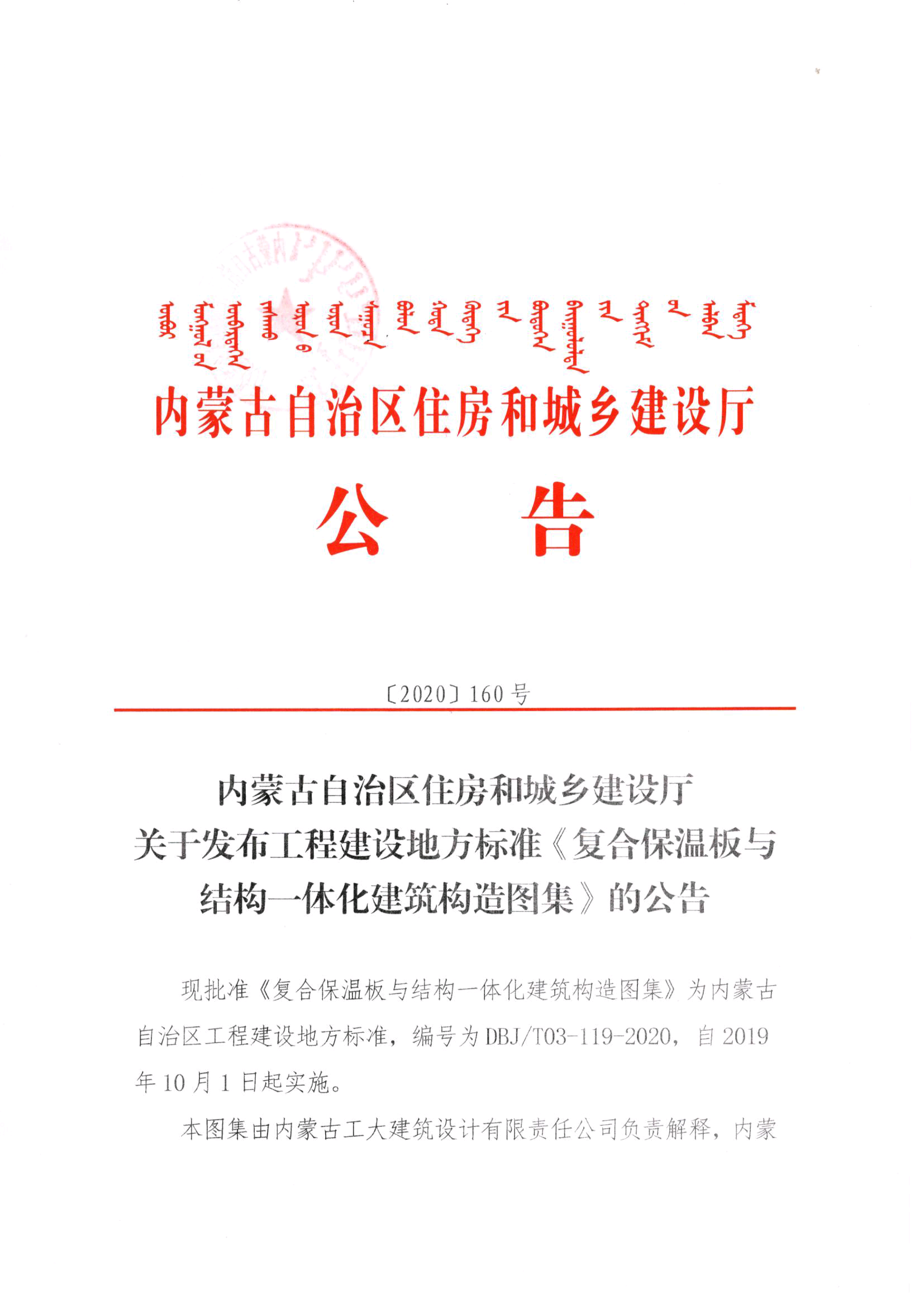 內蒙古自治區(qū)住房和城鄉(xiāng)建設廳關于發(fā)布工程建設地方標準《復合保溫板與結構一體化建筑構造圖集》的公告